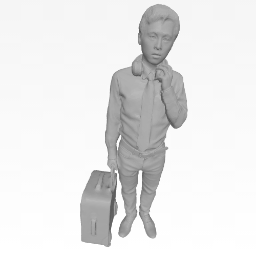 This businessman with suitcase mini shows a smartly dressed man in a shirt and tie, pulling a suitcase while holding headphones around his neck. The businessman with suitcase mini adds modern travel and commuter realism to model railway platforms, airport scenes, city dioramas, and contemporary tabletop settings.
